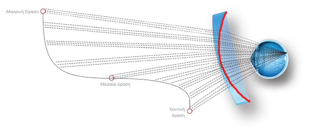 Ο μοναδικός σχεδιασμός φακών είναι πλήρως βελτιστοποιημένος για κάθε χρήστη. Ένα ευρύ πεδίο όρασης εγγυάται τέλεια καθαρότητα εικόνας και εξαιρετική άνεση χρήστη. Η τεχνολογία Digital Ray-Path® επέτρεψε να αλλάξει ο σχεδιασμός της εσωτερικής επιφάνειας του φακού και να μειωθεί η εκτροπή των ακτινών που προσπίπτουν λοξά.